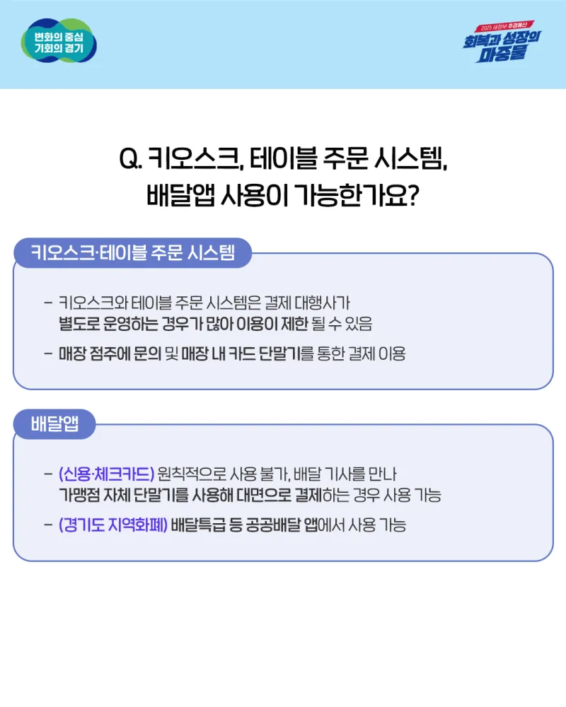 ▶ (신용·체크카드) 원칙적으로 사용 불가, 배달 기사를 만나 가맹점 자체 단말기를 사용해 대면으로 결제하는 경우 사용 가능 ▶ (경기도 지역화폐) 배달특급 등 공공 배달 앱에서 사용 가능 |