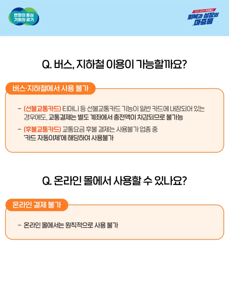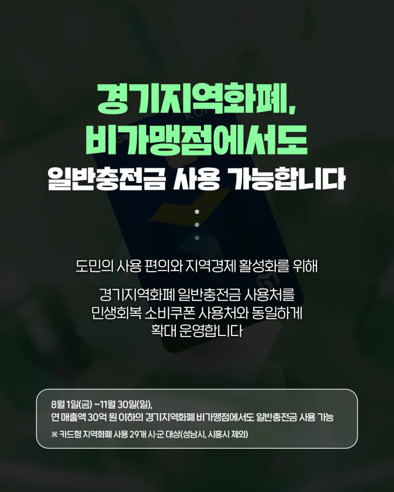 [기존] 연 매출 12억 원 초과하는 사업장 및 대규모 점포 내 개별 점포 등에 사용 제한 [변경] ▶연 매출 12억 원 초과하는 사업장 및 대규모 점포 내 개별 점포 등에서 사용 제한 해제 ▶연 매출 30억 원 이하의 경기지역화폐 비가맹점 사용 허용 |
