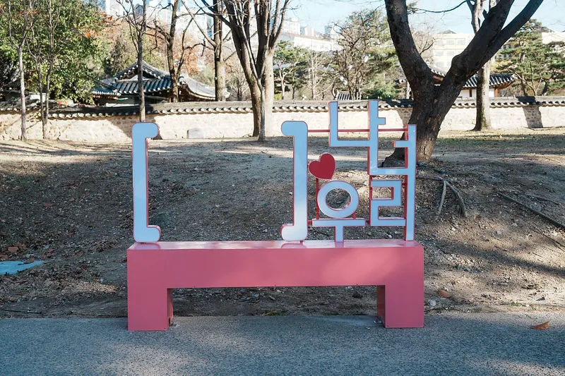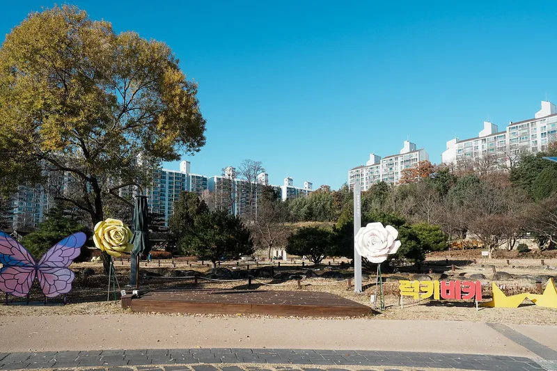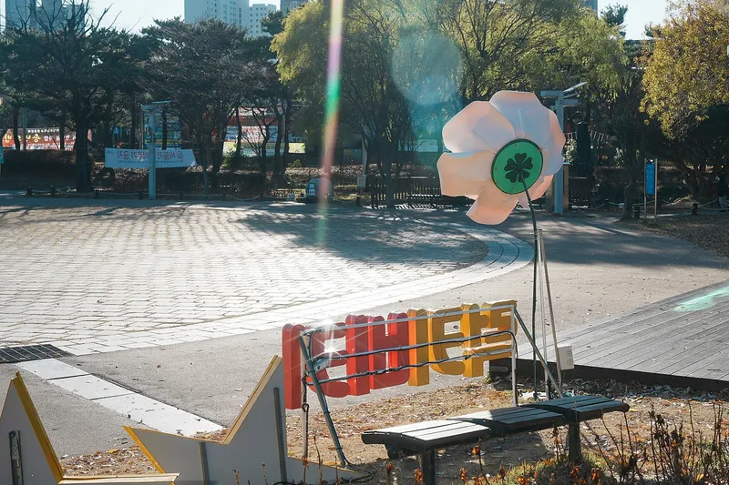 동춘당 역사공원 내 벤치 주변으로 있는 꽃 형상의 조명과 나비 형상의 조형, 행운의 뜻을 염원해 볼 수 있는 '럭키비키' 이색 포토존 공간이 마련되어 있습니다.