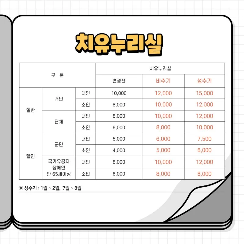 시설별 이용요금은 성인기준 약 2,000원 인상됐으며, 순창군민은 50% 할인됩니다. 치유누리실의 경우 단일요금이었던 것을 비수기와 성수기(1~2월, 7~8월) 요금을 다르게 적용하였습니다. 그리고 도반욕실의 이용시간을 기존 40분에서 일반이용(40분)과 특별이용(60분)으로 나누어 운영하고, 온천정원은 기존 1,000원에서 2,000원으로 이용요금이 변경됐으나 순창군민은 종전대로 무료 입장이 가능합니다.