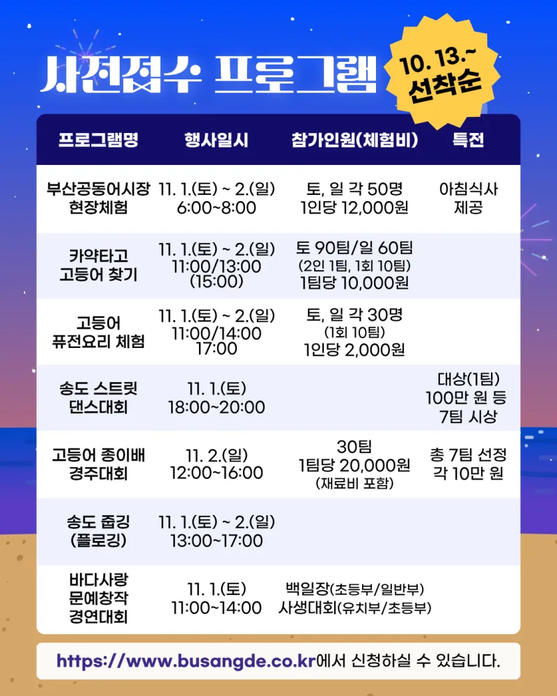 ✅ 고등어축제 홈페이지(www.busangde.co.kr) > 세부프로그램 > 프로그램하단 사전접수 버튼 클릭