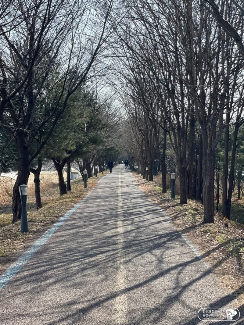 좌우로 나무가 감싸져 있어 아늑한 산책로에요. 아직은 푸른 잎들이 나지 않았지만 벚꽃 시즌을 지나면 순식간에 파릇파릇하고 아늑한 초록 동굴이 만들어져요.