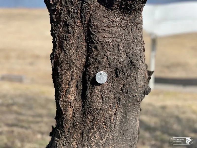 벚나무에는 일련 번호가 달려있어요. 작은 나무에는 별다른 번호가 붙어있지 않은 걸로 보아 큰 나무에만 붙어있는 것 같기도 하네요. 아님 벚나무에만 달려있는 걸까요? 나무가 배꼽 피어싱 하고 있는 것 같아서 괜히 힙해 보입니다.