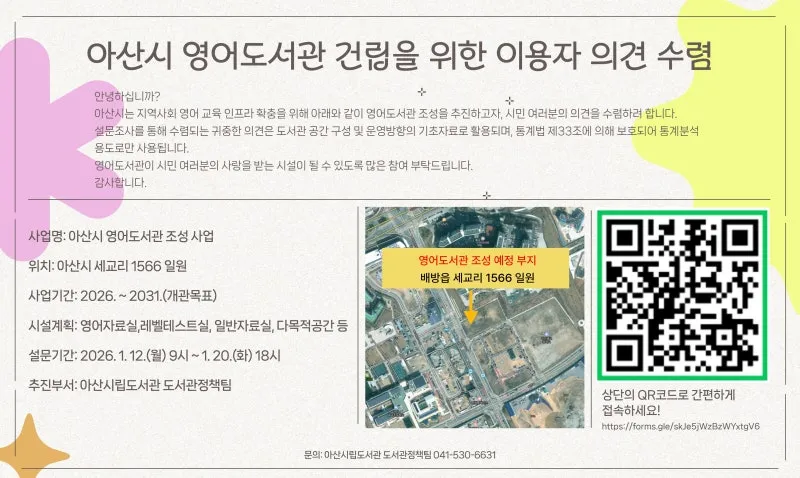 안녕하십니까? 호서대학교 산학협력단에서는 “아산시 영어도서관 설립 타당성 및 기본계획 수립” 연구용역을 수행중에 있습니다. 아산시는 글로벌 시대 시민의 언어역량강화 및 지역 주민 복합문화공간 조성을 위해 2031년 개관을 목표로 세교리 1566, 1567 부지에 영어 도서관을 건립하려 합니다. 아산시 영어도서관의 성공적인 사업 추진을 위해 본 설문 조사를 실시하여, 아산시 영어도서관의 고유 업무 및 시민을 위한 복합문화공간 조성, 정보서비스 내용 및 장서 개발 방향 등의 참고 자료로 활용할 예정입니다. 여러분께서 응답하신 소중한 의...