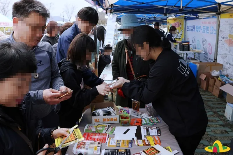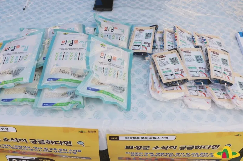 의성 벚꽃축제장에 오셨으니 뭔가 받아 가시면 더 좋을 거 같은데요~ 의성군 종합홍보 부스에 가시면 의성톡톡서비스를 구독하시고 의성 쌀이나 양말을 선물로 받으실 수 있었어요! 올라경북 부스에 가시면 카카오톡 친구추가 하시고 미나리를 받을 수 있었답니다.+_+