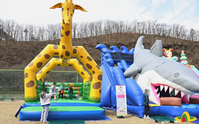 축제장 메인무대에서 음악분수 방향으로 조금 가면 풋살장에 어린이 놀이터 에어바운스가 설치되어 있는데요. 아이들이 좋아하는 기린, 상어 등 동물과 동화 속 왕국처럼 캐릭터들이 귀여워서 아이들이 좋아하는 곳이었어요. 10시~ 18시까지 운영되었는데, 아이들이 웃음소리를 들으니 절로 기분이 좋아지는 것 같네요 ^_^