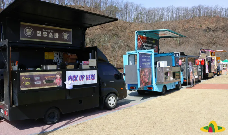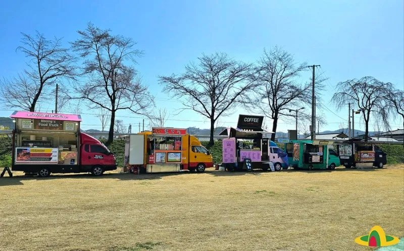 의성 벚꽃축제장에도 푸드트럭존이 있어서 야끼소바, 스테이크, 소떡소떡, 다코야키, 초밥, 추로스, 회오리 감자, 피자, 닭강정, 커피, 닭꼬치 등을 살 수 있고, 근처에 앉아서 먹을 수 있는 의자들도 곳곳에 배치되어 있었습니다.