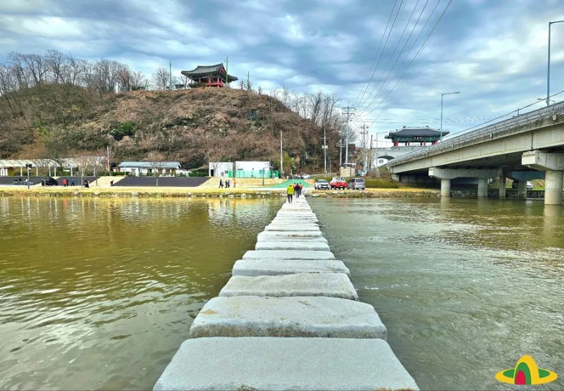 2코스로 가기 위해서 돌다리를 건너야 하는데요. 비가 내리면 물이 많이 차 있으니 건너실 때 조심히 건너시고 아이들은 장난을 치지 않도록 보호자가 함께 건너가 주시길 부탁드립니다.:) 돌다리로 가기 전에 음악분수와 이제 막 피려고 하는 벚꽃도 볼 수 있었어요~🌸