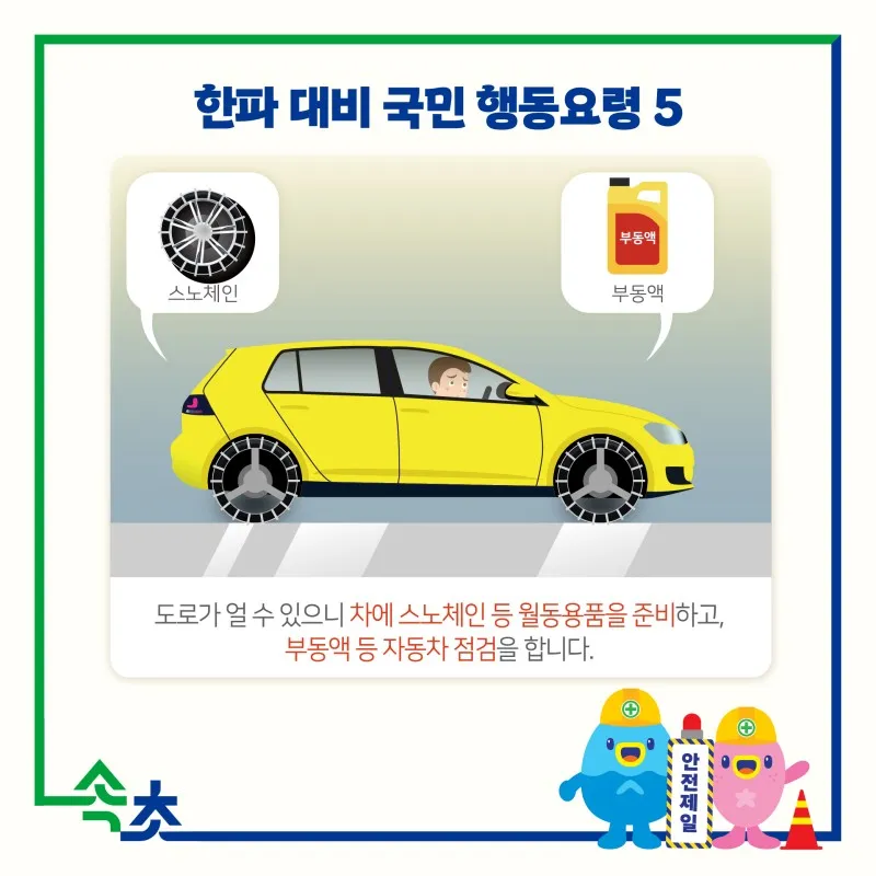 5.도로가 얼 수 있으니 차에 스노체인 등 월동용품을 준비하고, 부동액 등