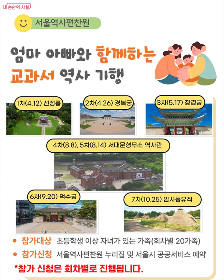 서울역사편찬원이 매주 토요일, 부모와 자녀가 함께 역사 교과서에 나오는 문화유산을 직접 체험하는 답사 프로그램 ‘엄마아빠와 함께하는 교과서 역사기행’ 프로그램을 운영하고 참여자를 모집한다.