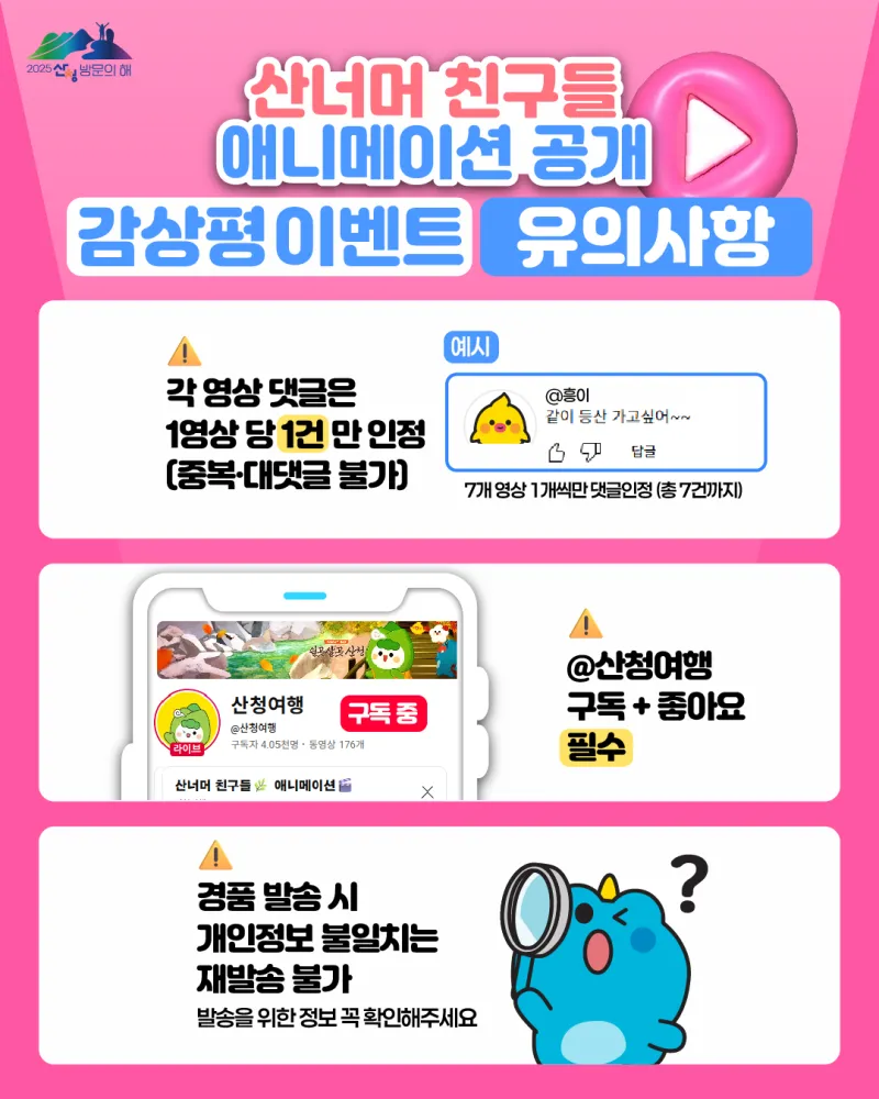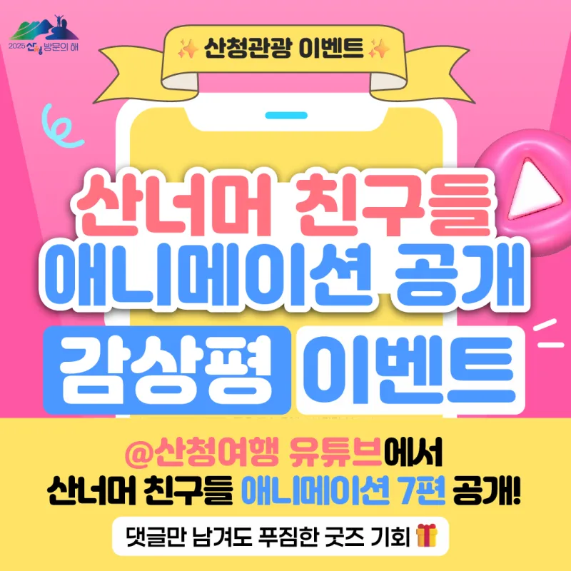 🎈2025산청방문의해🎈 📢 산너머 친구들 캐릭터 애니메이션 공개 기념 감상평 이벤트! <@산청여행>유튜브에 올라온 산너머친구들 애니메이션 7편을 감상하고 소감을 댓글로 남겨주세요. 추첨을 통해 산너머 친구들 굿즈 세트(5만원 상당) 50개와 산청관광 굿즈 (피크닉매트, 마우스패드) 10개를 드립니다. 📆이벤트 기간 : 2025. 09. 29.(월) ~ 10. 13.(월)📢당첨자 발표 : 2025. 10. 21.(화) 예정🎁이벤트 경품 ✔️ 댓글 1번이상 작성시 : 산너머 친구들 굿즈 세트(5만원 상당) 증정 * 5...