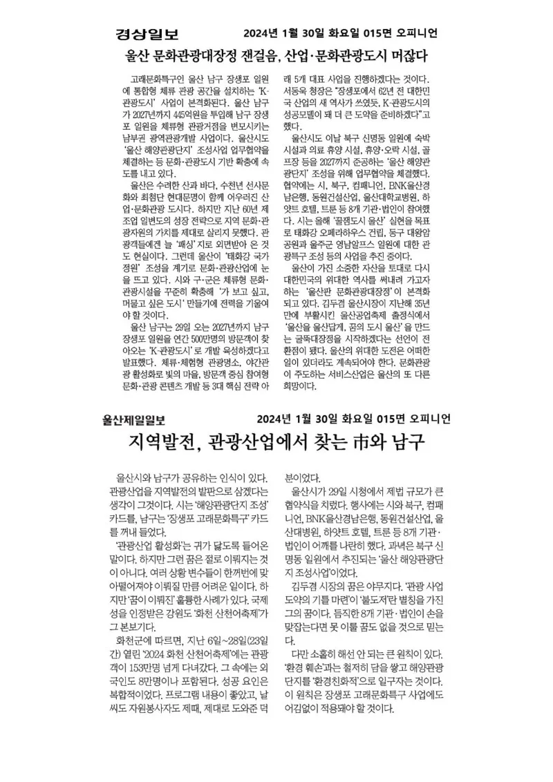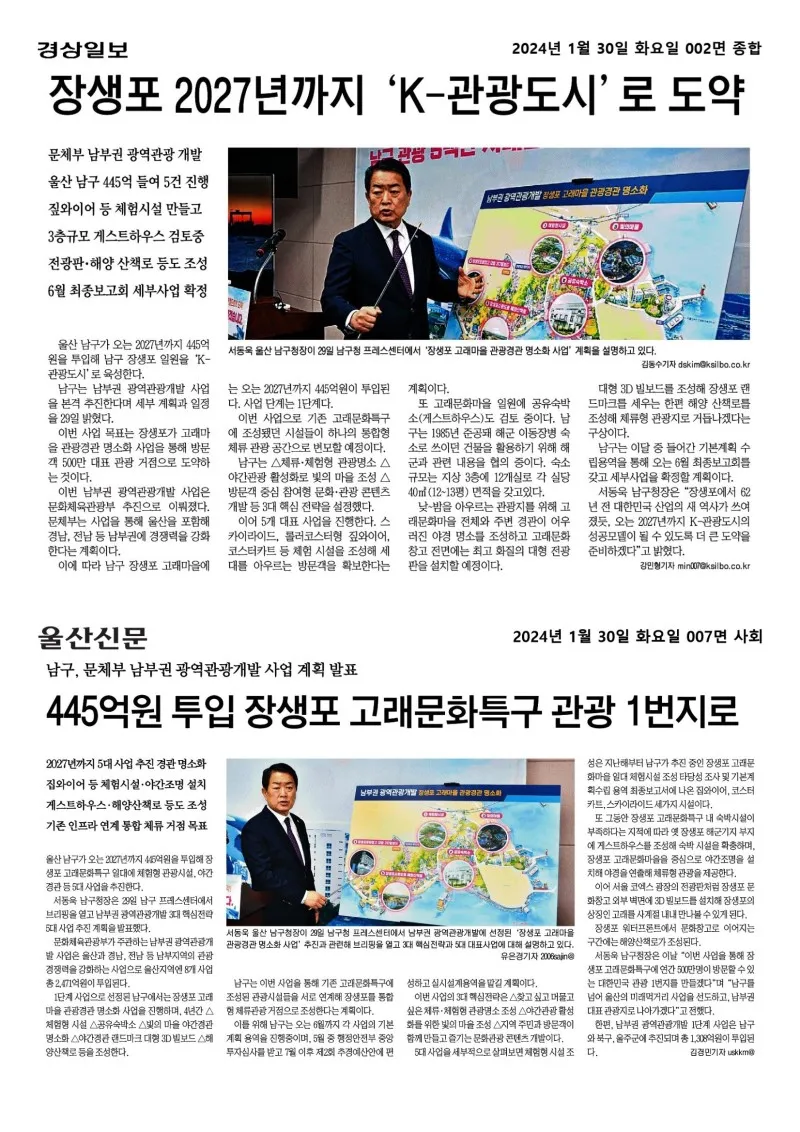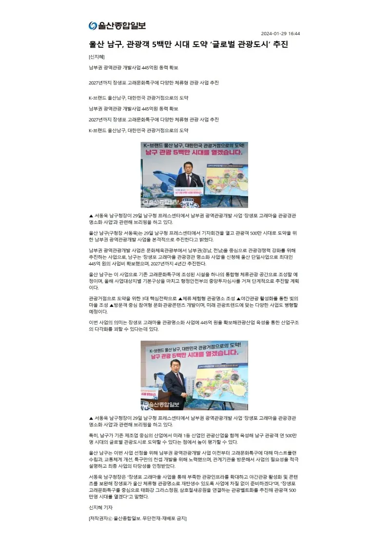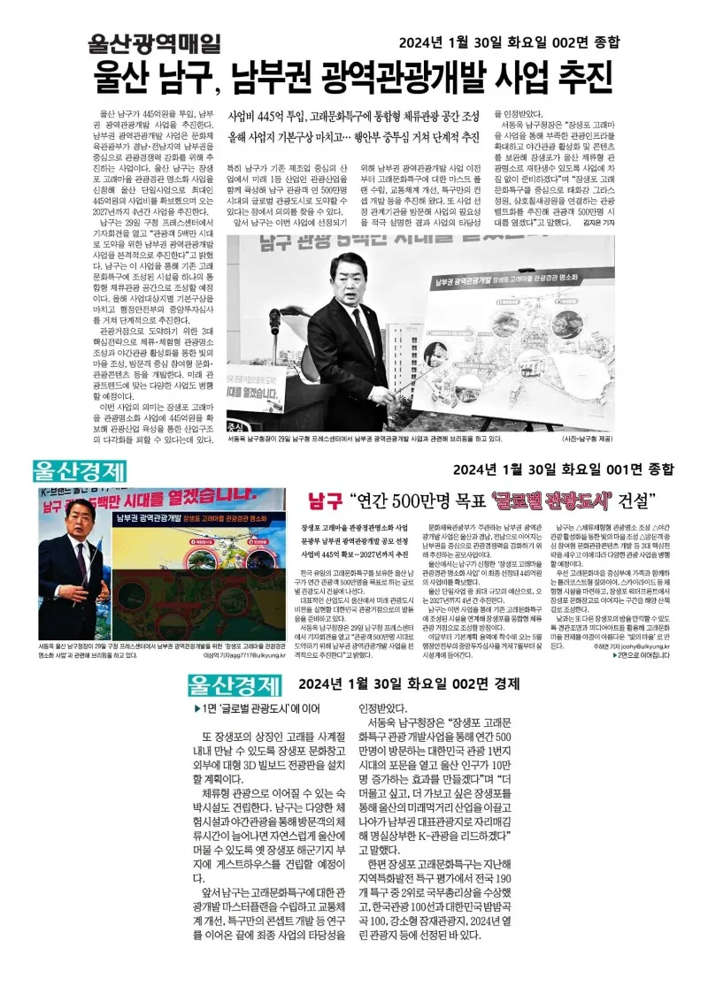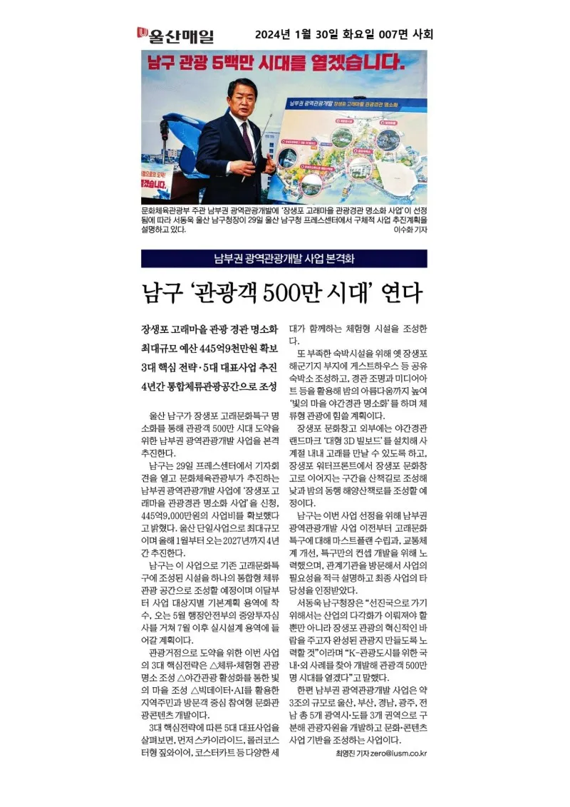 웰로2년 전[행복남구 오늘의신문] 남부권 광역관광개발로 500만 관광도시로 도약하겠습니다(1월 30일 화요일) ※본 자료는 뉴스 저작권 이용 규정 및 법령에 따라 관련 부서의 허락 없이 제3자가 재가공, 대외전송 및 공유가 불가합니다※ 이 블로그 ▶행복남구 오늘의신문 카테고리 글 이전 이전 다음 다음 {"title":"[행복남구 오늘의신문] 남부권 광역관광개발로 500만 관광도시로 도약하겠습니다🐳🐬🐋(1월 30일 화요일)","source":"https://blog.naver.com/ulsan-namgu/223338035354","blogName":"울산광역시..","blogId":"ulsan-namgu","domainIdOrBlogId":"ulsan-namgu","logNo":223338035354,"smartEditorVersion":4,"meDisplay":true,"outsideDisplay":false,"cafeDisplay":false,"blogDisplay":false,"lineDisplay":true} #울산남구#행복남구#미래#희망#문화체육관광부#남부권광역관광개발사업#장생포고래문화마을#장생포고래문화특구#스카이라이드#롤러코스터#짚와이어#코스터카트#공유숙박소#게스트하우스#야간명소#대형전광판#장생포문화창고#3D빌보드#랜드마크#해양산책로출처:https://blog.naver.com/ulsan-namgu스크랩