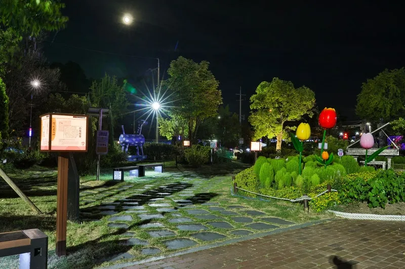 달빛 아래 다양한 조명과 포토존으로 밤의 낭만을 즐길 수 있는 사문진에서