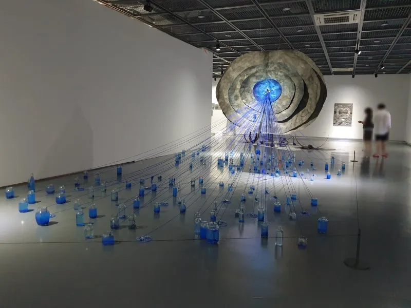 우리가 일상에서 만나는 물건들, 그리고 푸른 유리병과 실들이 이어진 '생성지점'은 눈길을 사로잡으며 상상력을 자극하는 것 같아요