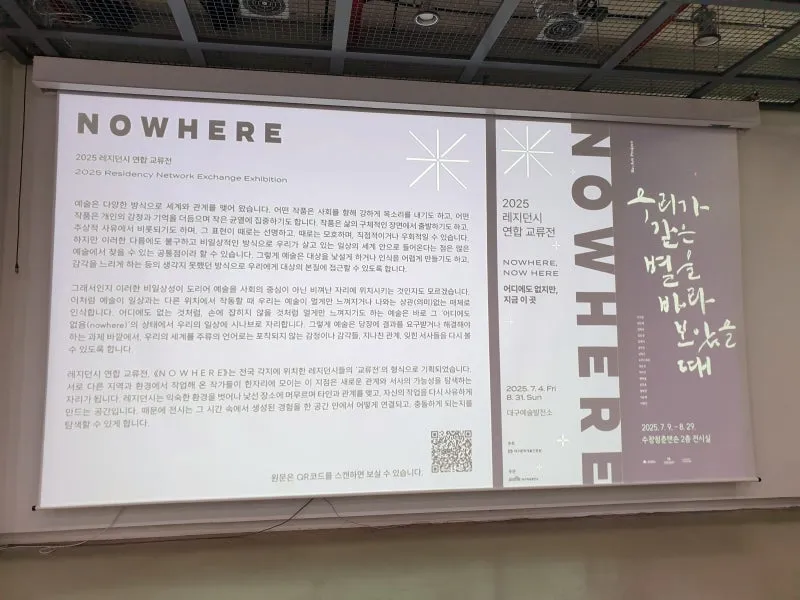2025 레지던시 연합 교류전 'NOWHERE(Nowhere, Now Here)-어디에도 없지만, 지금 이곳' 전시는 7월 4일부터 8월 31일까지 을 개최하며, 누구나 무료로 관람할 수 있어요.