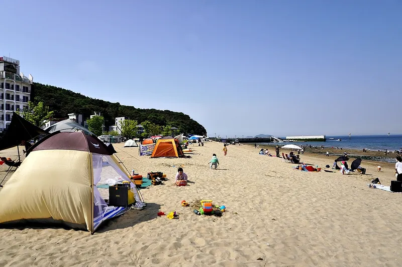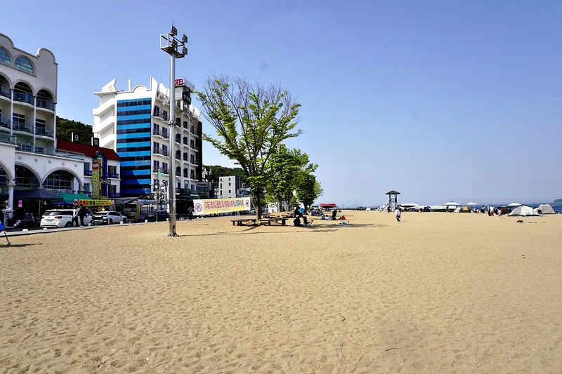 왜목마을 해수욕장은 6월에 이미 여름이네요. 넓은 모래해변에는 텐트가 들어섰고 제법 넓게 드러난 갯벌에서는 갯벌체험이 한창입니다. 물속에 들어가지 않을 뿐 갯벌과 모래 사변에서 여름을 즐깁니다.