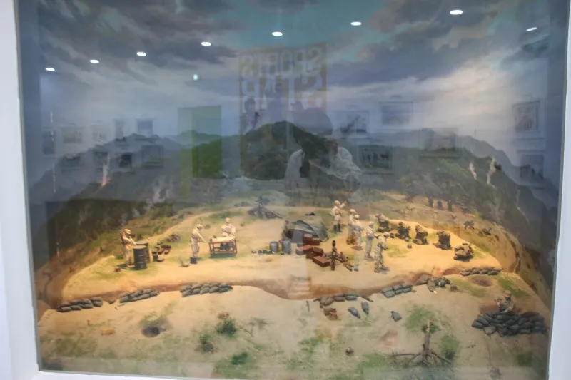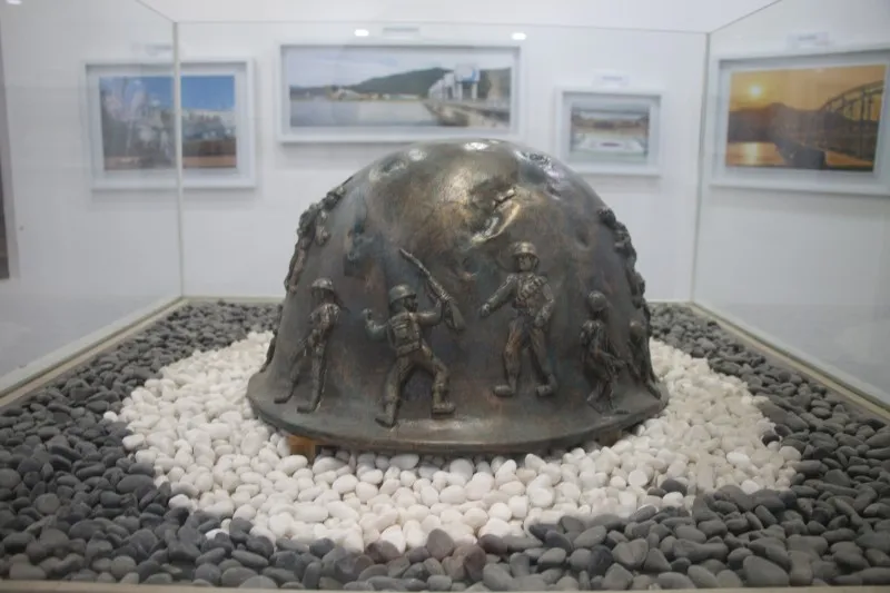총알 자국이 있는 철모 모형에서 한국 전쟁의 치열함을 간접적으로 알 수가 있습니다
