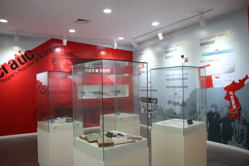 북한 체제 및 실상을 알려주는 북한실입니다 북한의 대남 도발 사례와 북한의 각종 물품(의류·서적·화폐·우표 등)들이 전시되어 있습니다