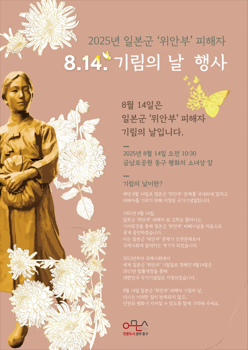 ○ 일시 : 2025. 8. 14.(수) 10:30 ~ - 추모공간 운영 : 2025. 8. 13.(수) ~ 8. 19.(화) ○ 장소 : 동구 평화의 소녀상(금남로공원 내) ○ 참여 : 주민 누구나(자유롭게 헌화 참여) ○ 내용 : 헌화 공간 조성 및 운영 등 ○ 문의 : 동구청 인문도시정책과(☎ 608-2192) |