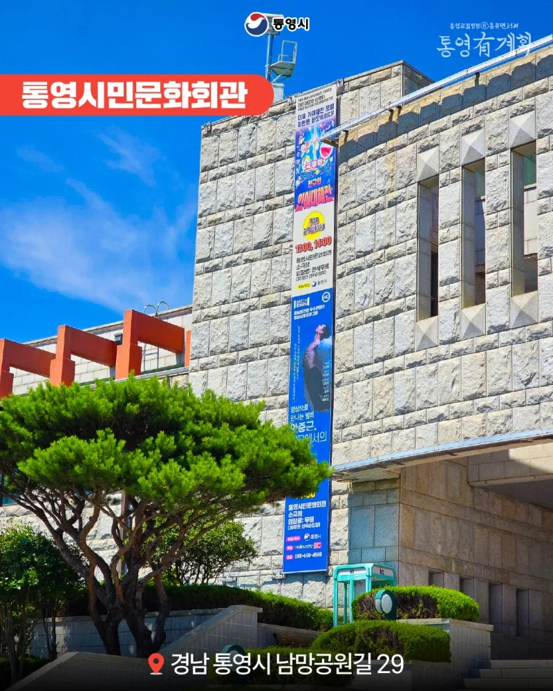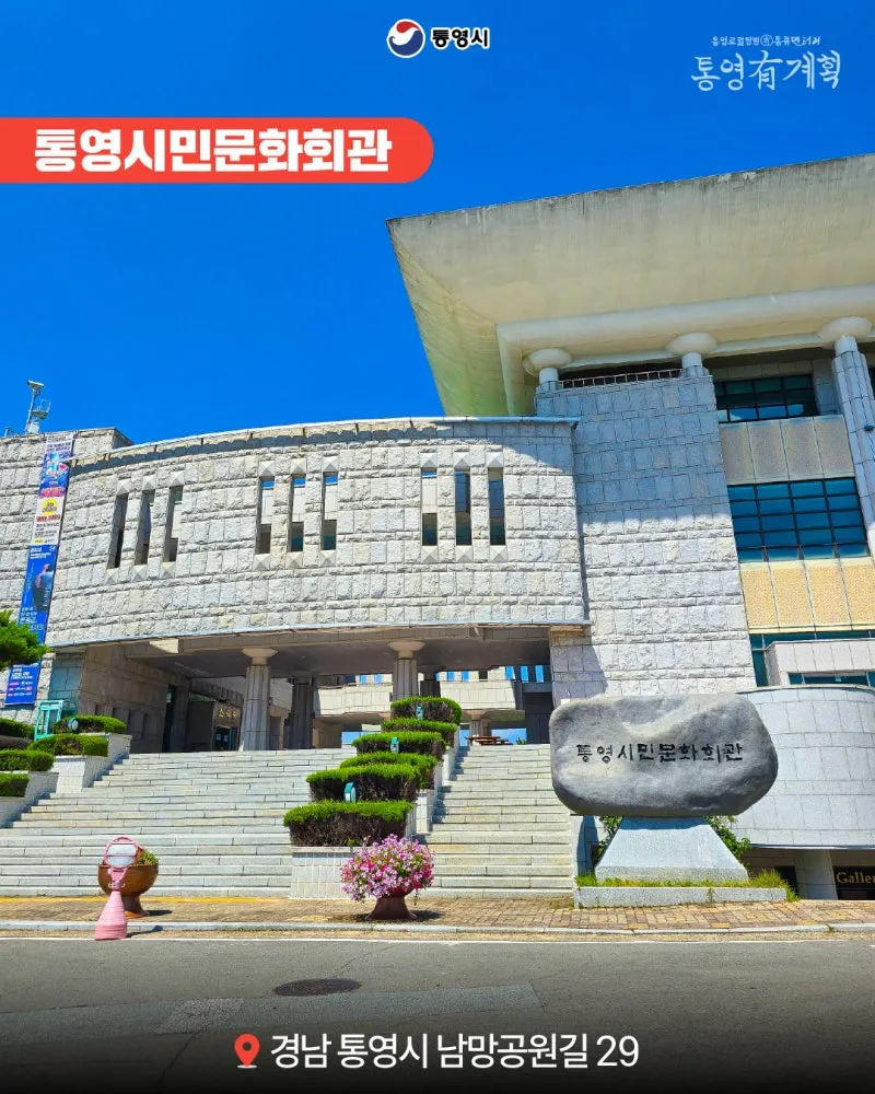 비주얼 홍보 비주얼 홍보. 순환 정지 비주얼 홍보. 순환 재생 1 2 공연/전시/행사 공연/전시/행사 더 보기 소극장 파크골프협회 신규회원 교육 기간 : 2025-07-25 ~ 2025-07-25 대극장 한미연합회 경남지부 창립총회 기간 : 2025-07-26 ~ 2025-07-26 소극장 어린이영화상영회 기간 : 2025-07-27 ~ 2025-07-27 최근 게시글 알림마당 등록된 내용이 없습니다. 알림마당 더 보기 대관서비스 사랑과 신뢰받는 통영시민문화회관 대관안내 대관예약현황 대관신청