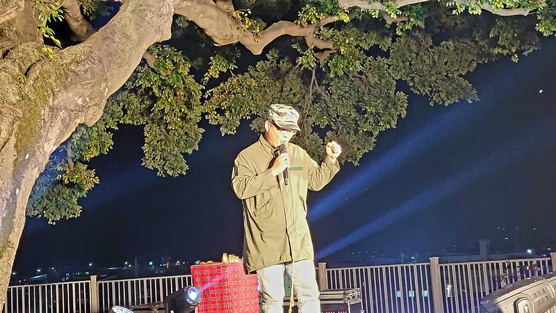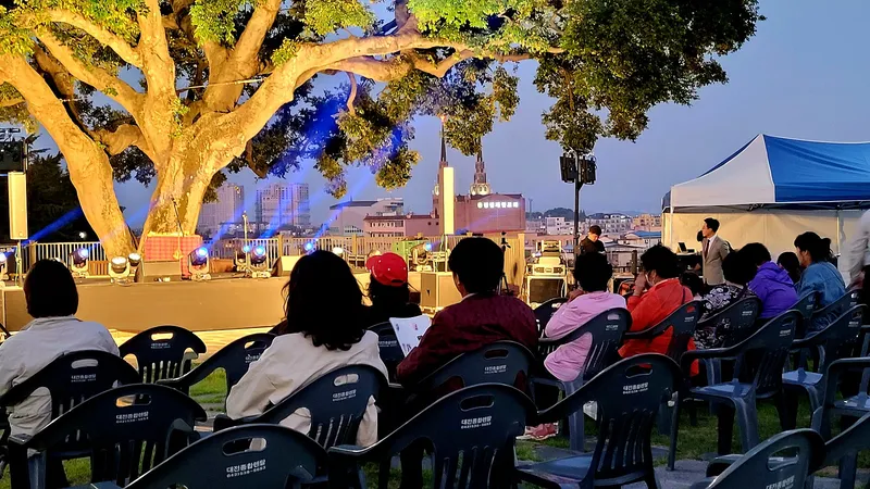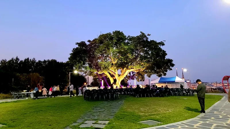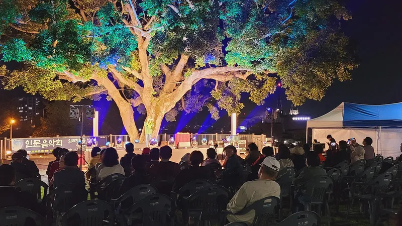 아담하게 만들어진 공원에 300년 된 것으로 알려진 큰 팽나무가 서 있고 그 아래 무대가 꾸며졌습니다. 아직 음악회가 시작하기 전 관객들이 모이기 시작합니다.