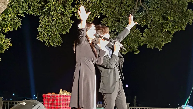 점점 어둠이 짙어가는 가을 저녁 음악회에 함께 온 가족들이 시작을 기다리는 동안 포토존에서 사진도 찍고 대화를 나눕니다.