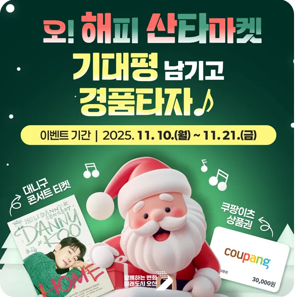 31 likes, 11 comments - osanholic - November 9, 2025: "???? 오산에서 즐기는 미리 크리스마스 ???? ‘오! 해피 산타마켓’ 기대평 남겨주시면 대니구 콘서트 티켓 또는 쿠팡이츠 상품권을 드려요 ???? ???? 산타마켓 기간 & 장소 - 2025. 11. 22(토) ~ 12. 31.(수) - 오산역광장, 아름다로 ???? 이벤트 참여 방법 ① 오산시 인스타그램(@osanholic) 팔로우+좋아요♥ ② 이벤트 게시물에 댓글로 기대평 + 필수 해시태그 + ‘참여완료’ 남기기 * 필수 해시태그 : #오해피산타...