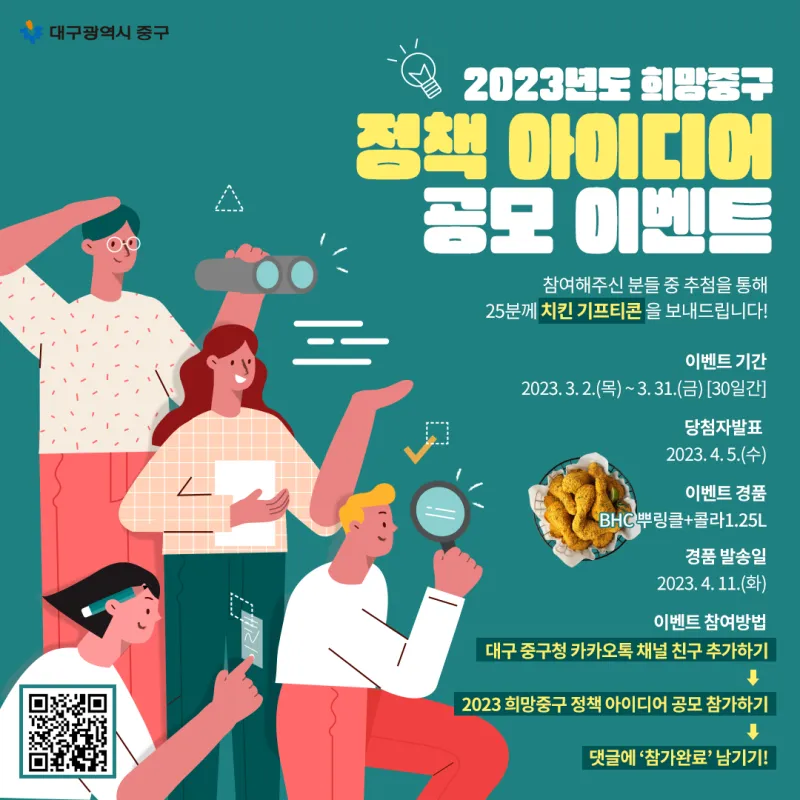 2023년도 희망중구 정책아이디어 공모 이벤트 참여하고 치킨 기프티콘 받아가세요!