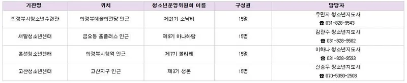 - 의정부시청소년재단에는 총 4개의 청소년수련시설이 있으며, 청소년운영위원회는 각 시설을 대표하는 자치기구입니다.