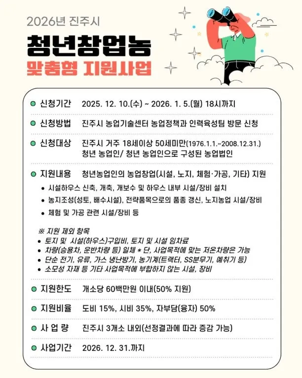 ????2026년 청년창업농 맞춤형 지원사업 ✅ 신청기간 : 2025. 12. 10. (수) ~ 2026. 1. 5. (월)/ 18시까지 ✅ 신청방법 : 진주시 농업기술센터 농업정책과 인력육성팀 방문 신청 ✅ 신청대상 〰️ 진주시 거주 18세 이상 ~ 50세 미만 (1976. 1. 1. ~ 2008. 12. 31.) 청년 농업인 〰️ 청년농업인으로 구성된 농업법인 ✅ 지원내용 ????시설농업분야
