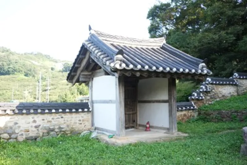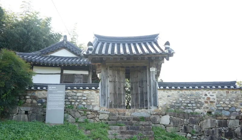 출입은 측면에 사주문의 대문이 설치되어 있으며, 대문은 목조 기와집으로 'ㅅ'자 형태로 되어 있음을 확인할 수 있습니다.