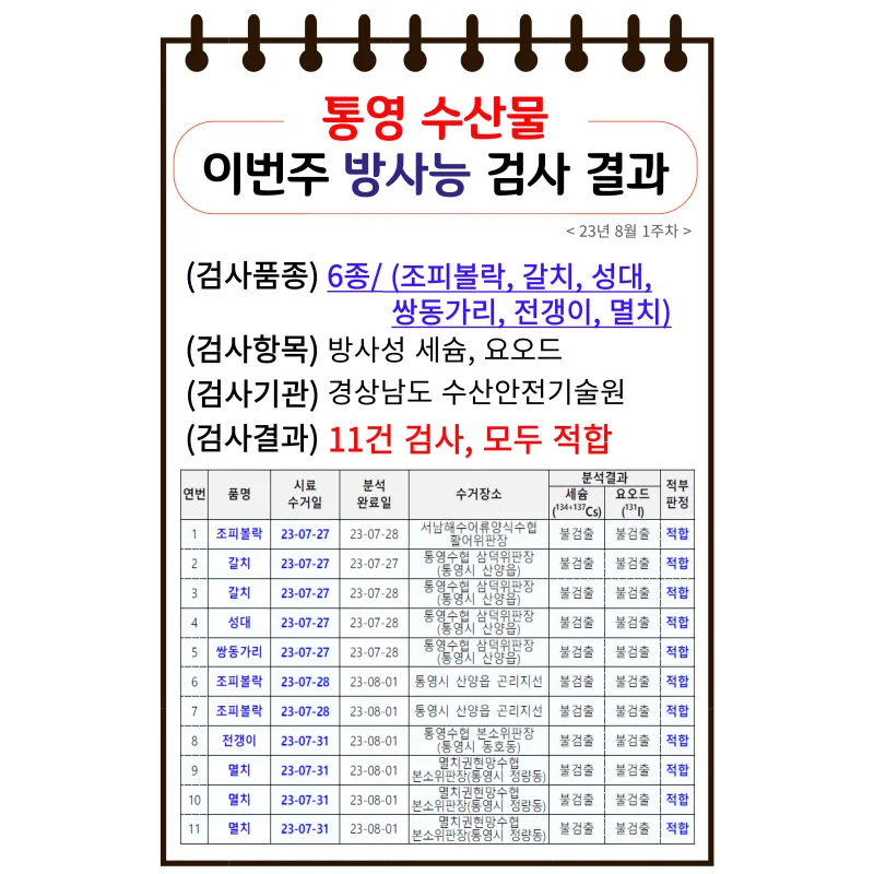 통영 수산물 이번주 방사능 검사 결과 / 8월 1주차