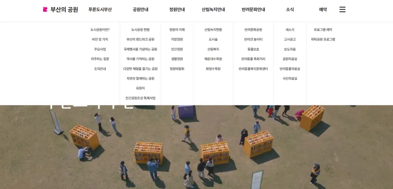 🌱 푸른 도시 부산 🌱 공원 안내 🌱 정원 안내 🌱 산림녹지 안내 🌱 반려 문화 안내 🌱 소식 🌱 예약 |