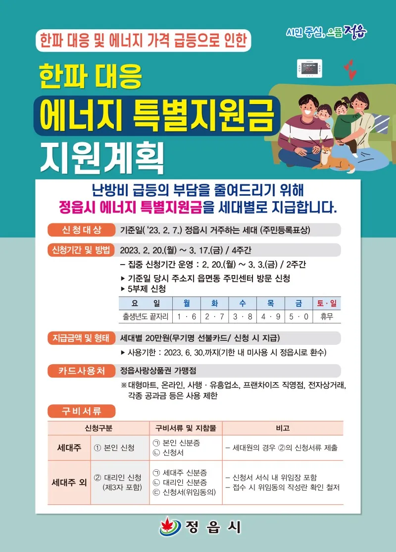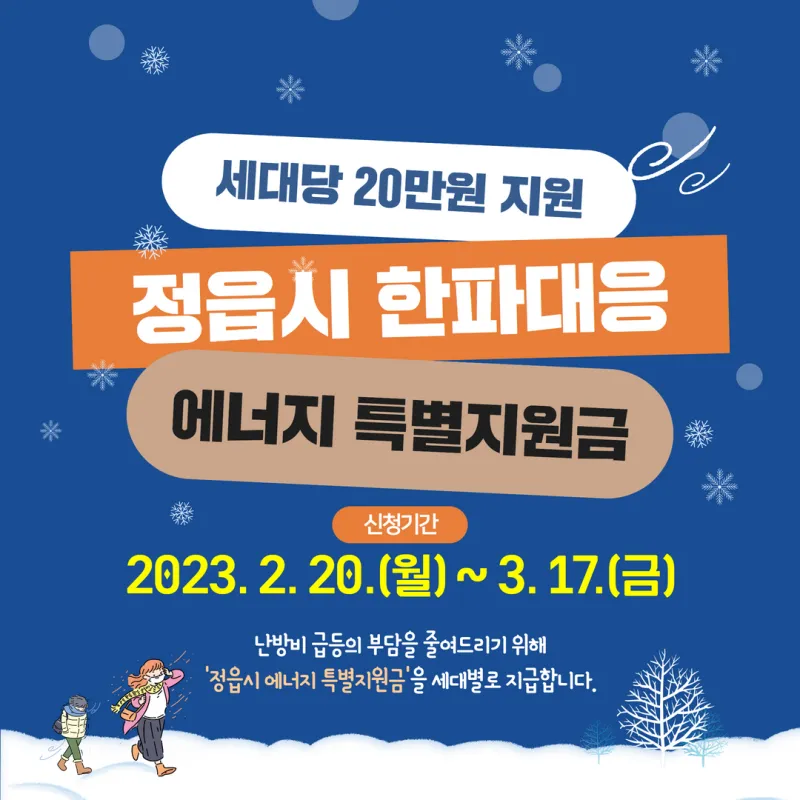 세대별 20만원 지원!|「정읍시 한파대응 에너지 특별지원금」 신청 안내