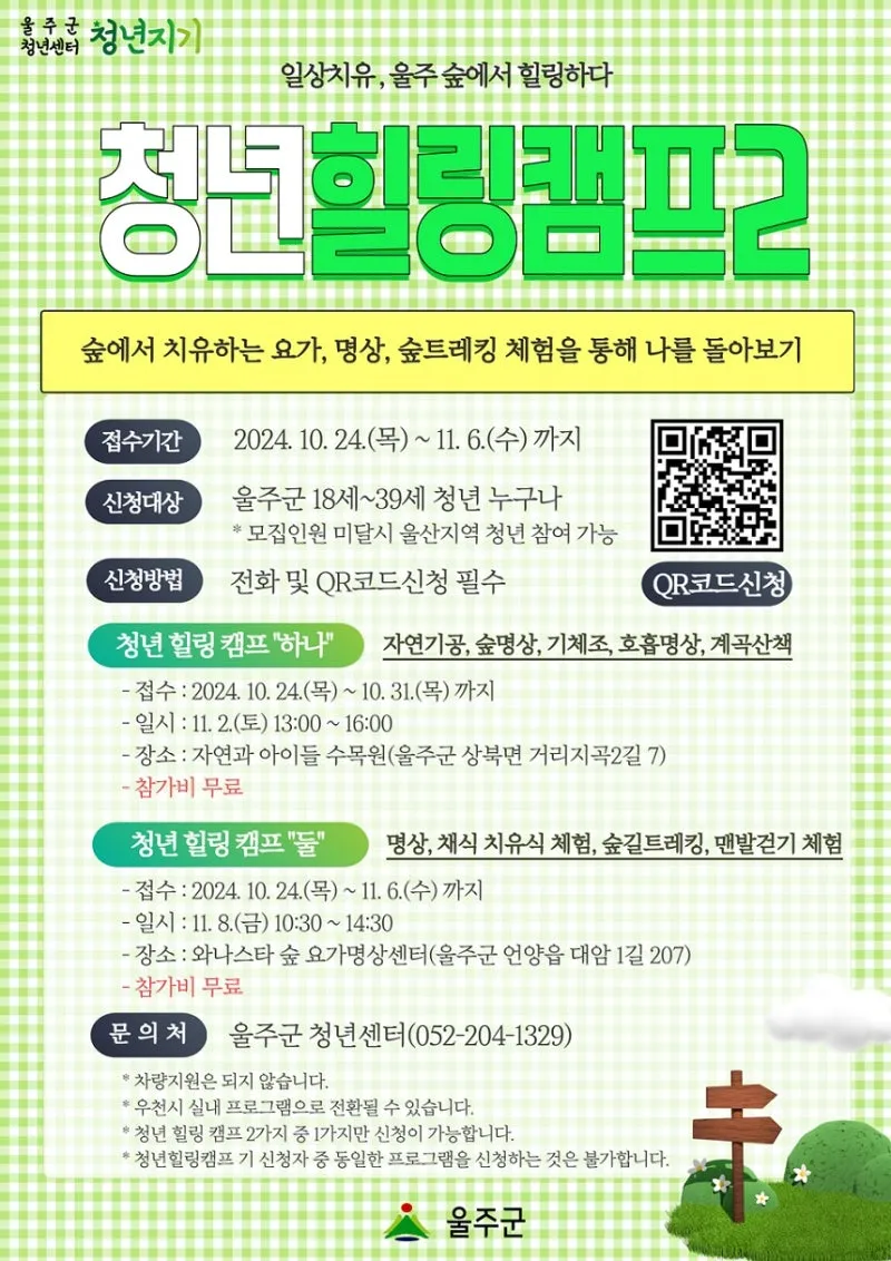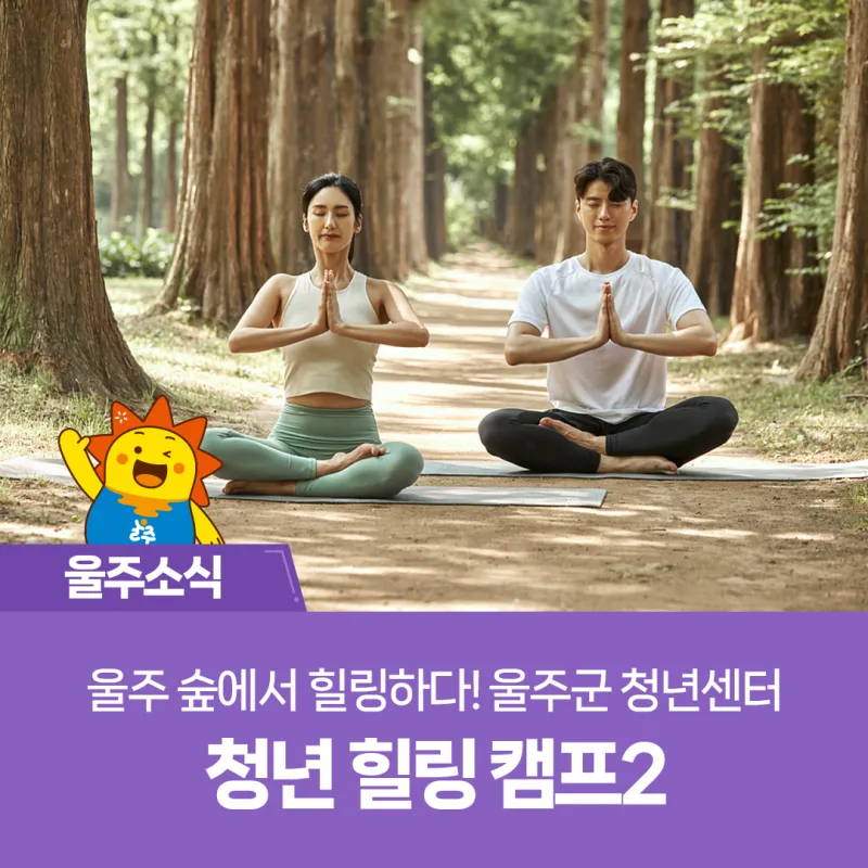 울주청년을 위한 다양한 교육, 문화, 활동을 지원하는 울주군 청년센터에서 울주 숲에서 힐링하는 '청년 힐링 캠프2'를 실시합니다. 숲에서 치유하는 요가, 명상, 숲트레킹 체험을 통해 나를 돌아볼 수 있는 시간, 청년 힐링 캠프에서 경험해 보세요!