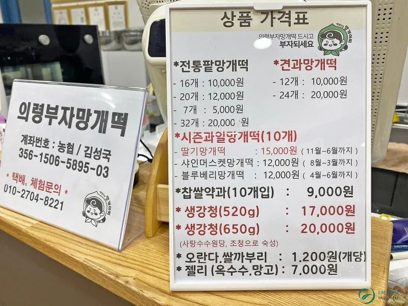의령부자망개떡 본점에는 망개떡 외에 옥수수, 망고 젤리나 오란다, 생강청, 약과도 판매하고 있습니다. 부자생강청은 작년에 토요애 쇼핑몰에서 주문해서 잘 먹고 있는데요 그 업체가 이곳인지는 이날 처음 알았답니다. 생강청도 맛있으니 꼭 드셔보세요.