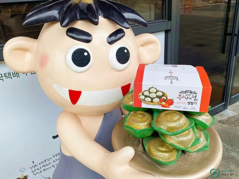 의령망개떡은 기본 맛은 자주 먹었던지라 이번에는 생딸기 망개떡을 구매해 보았습니다. 입구에 망개떡을 든 도깨비 동상이 있어 기념으로 사진도 찰칵!! 방문 인증샷은 꼭 남겨보세요.