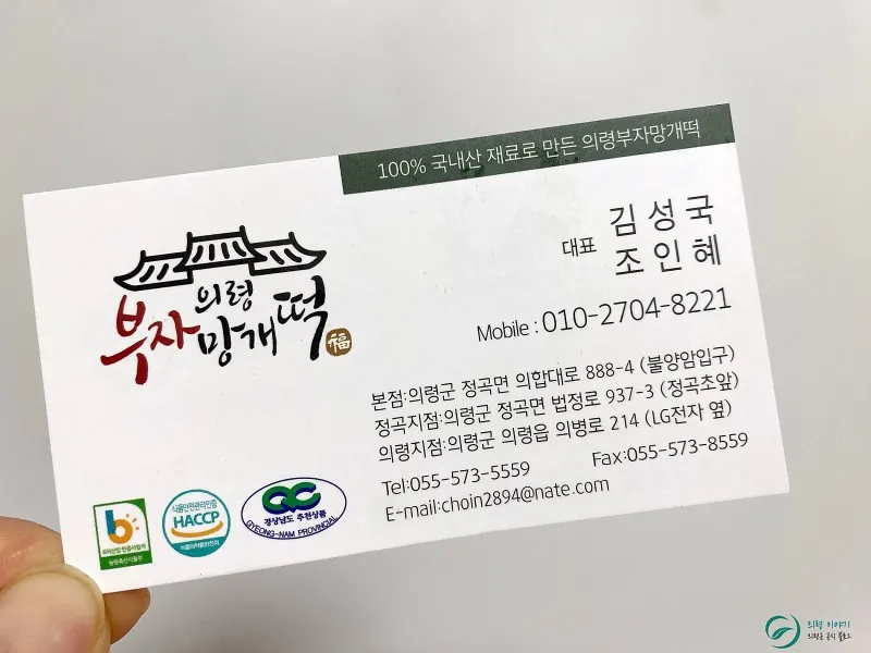 의령부자망개떡은 직접 구매도 가능하지만 택배도 가능합니다. 직접 구매하시려면 불양암 입구에 있는 본점이나 정곡초등학교 앞에 있는 정곡지점, 의령읍 LG전자 옆에 있는 의령지점에서도 구매가 가능합니다.