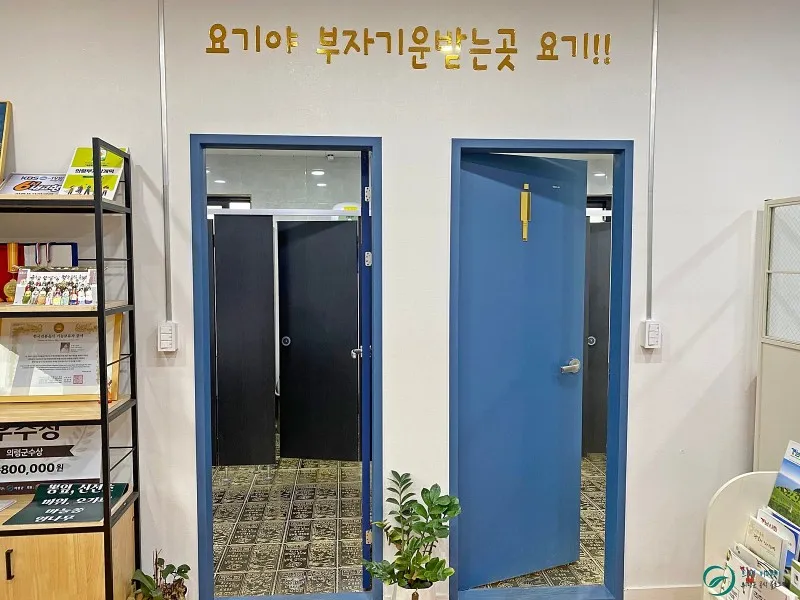 의령부자망개떡 본점에 방문하자마자 저의 시선을 끌었던 곳은 바로 화장실입니다. 파란색 문을 열고 들어가자마자 황금색 바닥에 '어머나!!' 소리가 터져 나오더라고요. 볼일 보는 내내 부자가 된 듯한 기분에 당장 로또를 사야겠다는 생각을 들었습니다. 참고로 화장실 문은 사진 촬영을 위해 열어두었다는 점 참고하세요.^^