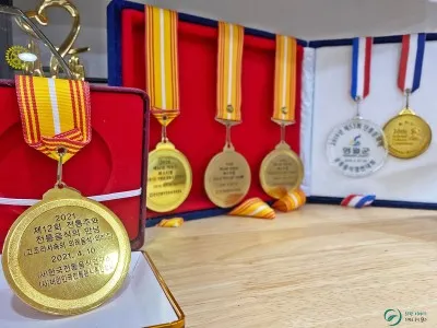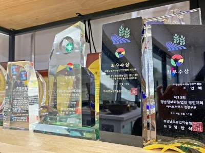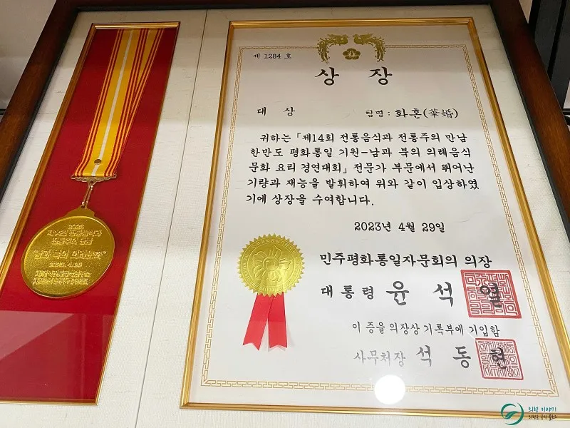 의령부자망개떡 본점은 화장실 바닥이 황금색으로 가득했다면 사무실 벽은 상패와 트로피, 상장으로 반짝반짝했습니다. 상 종류만 해도 수십 가지였는데요 그중에 대통령 이름과 대상이라고 적힌 상장이 유독 눈에 띄었습니다.