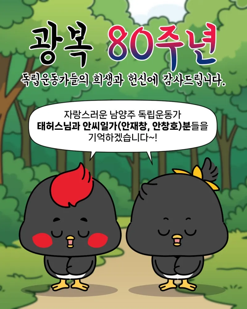 nyjholic - July 29, 2025: "[이벤트] 광복 80주년 웹툰 '크크,낙낙'과 남양주 독립운동가를 찾아라! 감상평 이벤트✒ 다들 알고 있는가? 올해가 광복 80주년이 되는 해라네 우리 크크와 낙낙이가 광복 80주년을 맞이해 웹툰으로 쏙- 들어가 특별한 사람들을 만나고 왔다는 구먼 바로 남양주시를 빛낸 독립운동가들이네⭐ 어때 자네들도 궁금하지 않은가? 남양주시 SNS를 통해 공개되는 웹툰 '크크,낙낙'과 남양주 독립운동가를 찾아라!를 보고 감상평과 광복 축하 메시지를 남겨주시구려 전화번호 뒷자리도 함께! 내 추첨을 통...