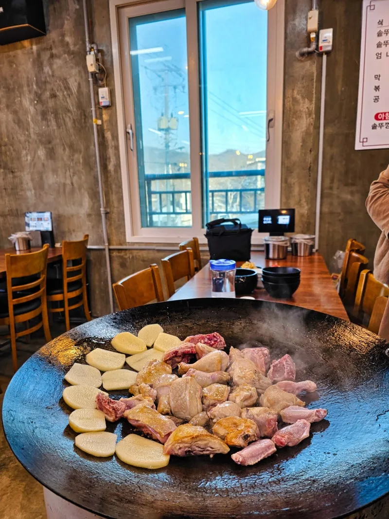 가평이나 양평에는 솥뚜껑 닭볶음탕을 판매하는 식당이 많지만, 대부분 완성된 음식을 서빙하는 방식입니다. 하지만 솥뚜껑만난닭은 테이블 옆에서 직접 조리하는 차별화된 방식으로 특별한 경험을 선사했습니다. 특히, 음식이 조리되는 과정의 쇼맨십은 보는 즐거움을 더했고, 지루할 틈 없이 음식이 익어가는 과정을 즐겁게 기다릴 수 있었습니다.