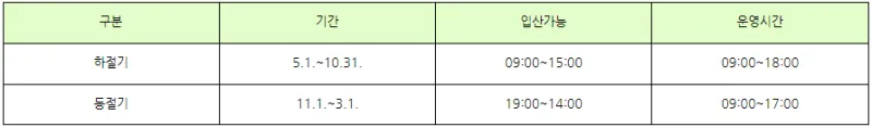 (하절기) 기간 5.1.~10.31. / 운영 9:00~18:00 / 입산가능 15:00까지