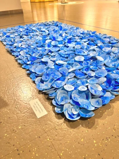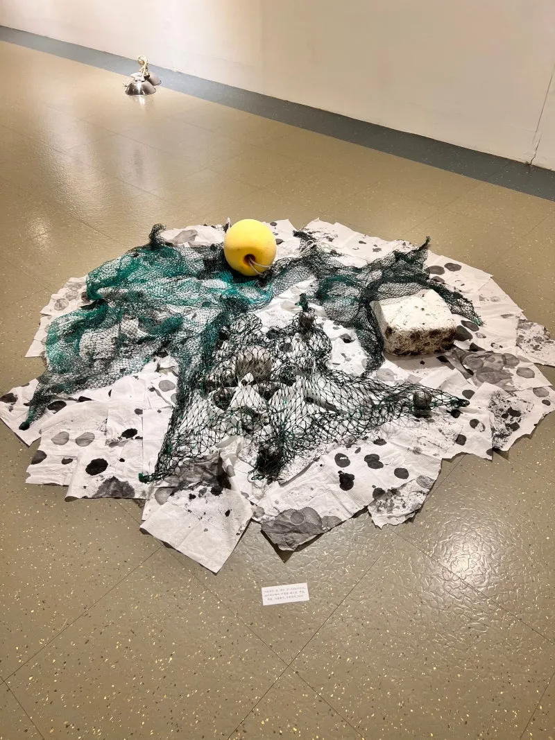 [이정미작가님 작품] Blue flower, 사라지는 것, 남는 것! (수집한 우유갑, 아크릴 구아슈, 대이작도에서 수집한 폐그물망, 스티로폼 부표, 먹물, 기름종이)