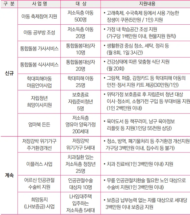 ※ 의료지원, 주거지원, 교육지원, 연료비 지원 등