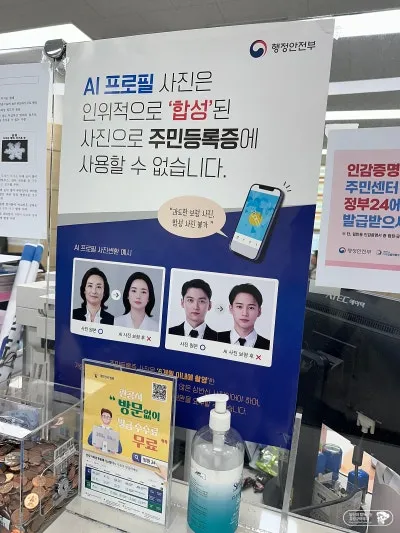 노은3동행정복지센터는 사회복지 창구, 대형폐기물 접수창구, 세무창구, 통합민원창구로 이루어져 있습니다. 대기하면서 본 안내 사항에서 AI프로필 사진은 인위적으로 ‘합성’ 된 사진, 과도한 보정사진은 주민등록증에 사용할 수 없다고 안내되어 있습니다.