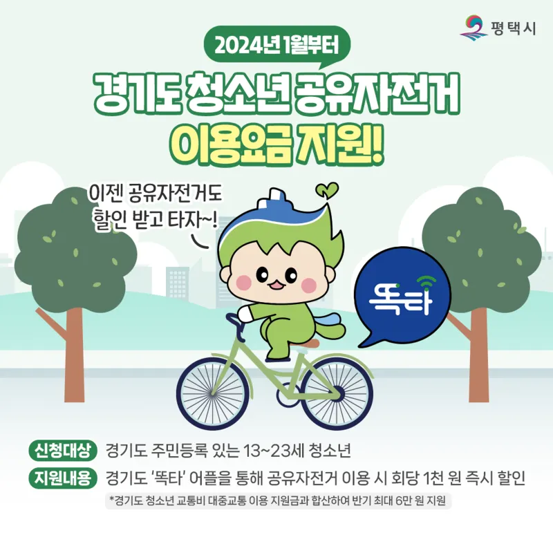 #평택 #평택시 #평택이 #공유자전거 #청소년자전거 #똑타 #경기도자전거 #공공자전거 #청소년교통비 #교통비지원 #경기도교통비