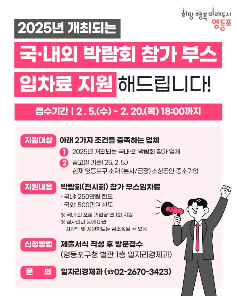 이미지 확대보기 ■ 지원대상: 202 5년 개최되는 국내외 전시회에 참가하는 공고일 현재 영등포구에 소재 (본사 또는 공장)한 소상공인 및 중소기업 ■ 접수기간: 2025. 2 . 5.(수) ~ 2. 20.(목) 18:00까지 ■ 지원내용: 2025년 개최되는 전시회(박람회) 참가 부스임차료 - (국내전시회) 250만원 한도 - (국외전시회) 500만원 한도 - (국내외포함) 기업당 연 1회지원 ※ 심사결과 등에 따라 지원액 및 지원한도는 감조정될 수 있음 ■ 신청방법: 방문접수 (영등포구청 별관 1층 일자리...