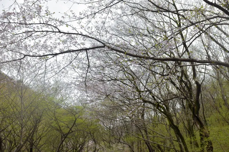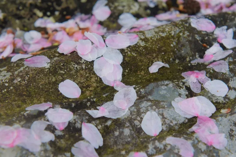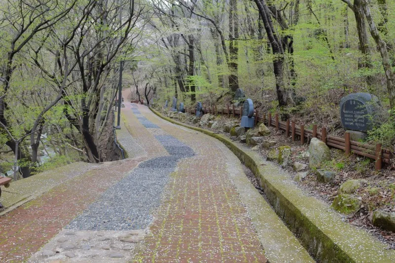 문동폭포에는 전날 내린 비의 영향으로 벚꽃이 이미 많이 떨어져있었습니다. 하지만 비 온 후의 이 정취가 또 사랑스러운 것이죠. 여린 분홍색 사이사이로 보이는 연둣빛 잎사귀도 정말 화사한 조화를 이루고 있었습니다. 촉촉하게 젖은 바위에 떨어진 벚꽃잎들이 쌓여서 만들어낸 다채로운 분홍의 향연 또한 며칠 후면 사라질 풍경이라 더욱 소중합니다.