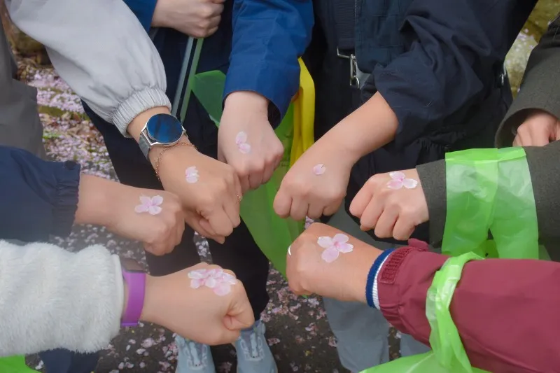 이 활동은 어린아이들도 함께 동참할 수 있을 것 같고, 핸드크림이 아니라 어떤 종류의 로션으로도 모두 가능하며 약간의 물로 손을 적시기만 해도 가능할 것 같았습니다. 동아리 회원분들은 모두 행복한 미소를 띄우며 삼삼오오 모여 주변에서 자연물을 모으기 시작하였고, 떨어진 벚꽃잎은 소중한 소재가 되어주었습니다.